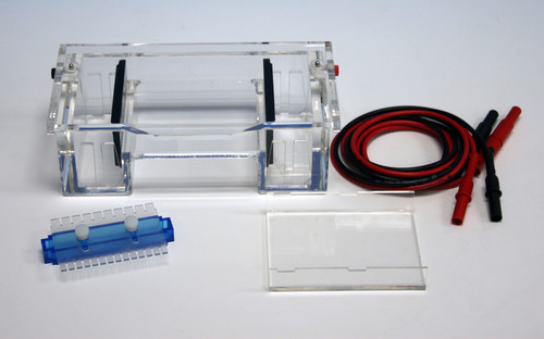 Gel Electrophoresis Apparatus feactions take the form of sharp discrete disc. with electrode, cable socket and buffer chamber